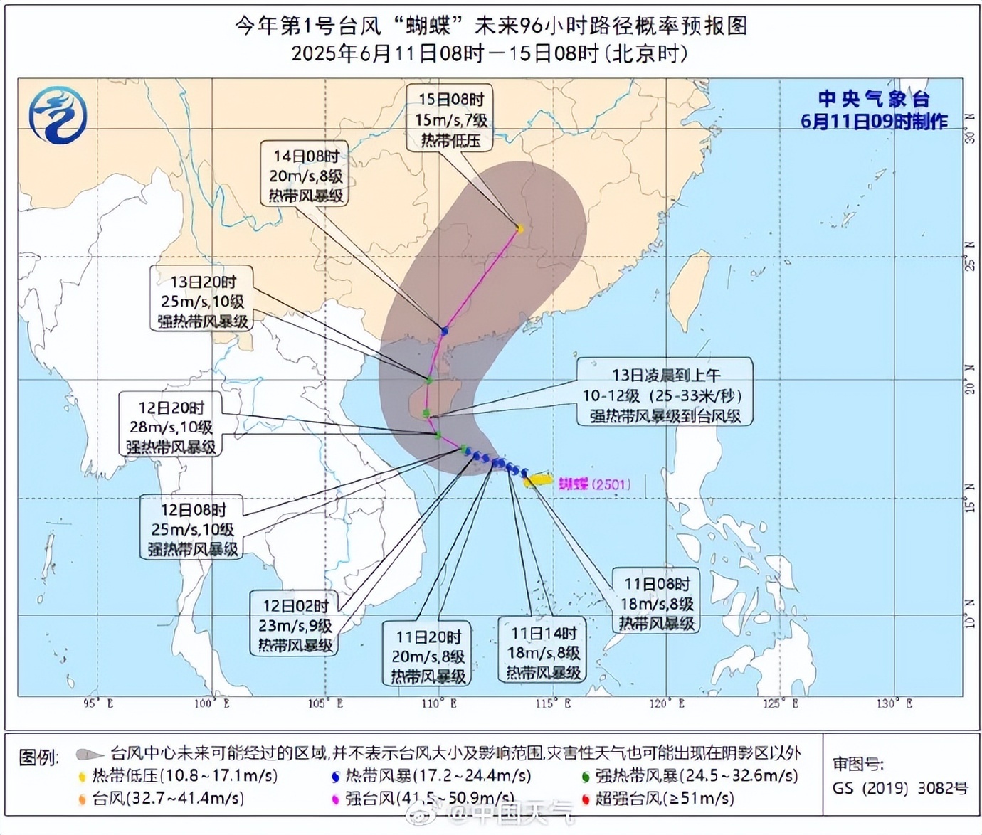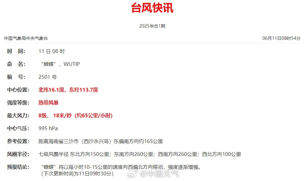 今天(6月11日)8时前后,南海热带低压增强为今年第1号台风“蝴蝶”(热带风暴级,英文名称:WUTIP;名字来源:中国澳门;名字意义:一种昆虫)。预计“蝴蝶”将于13日在海南岛南部到广东西部一带沿海登陆。